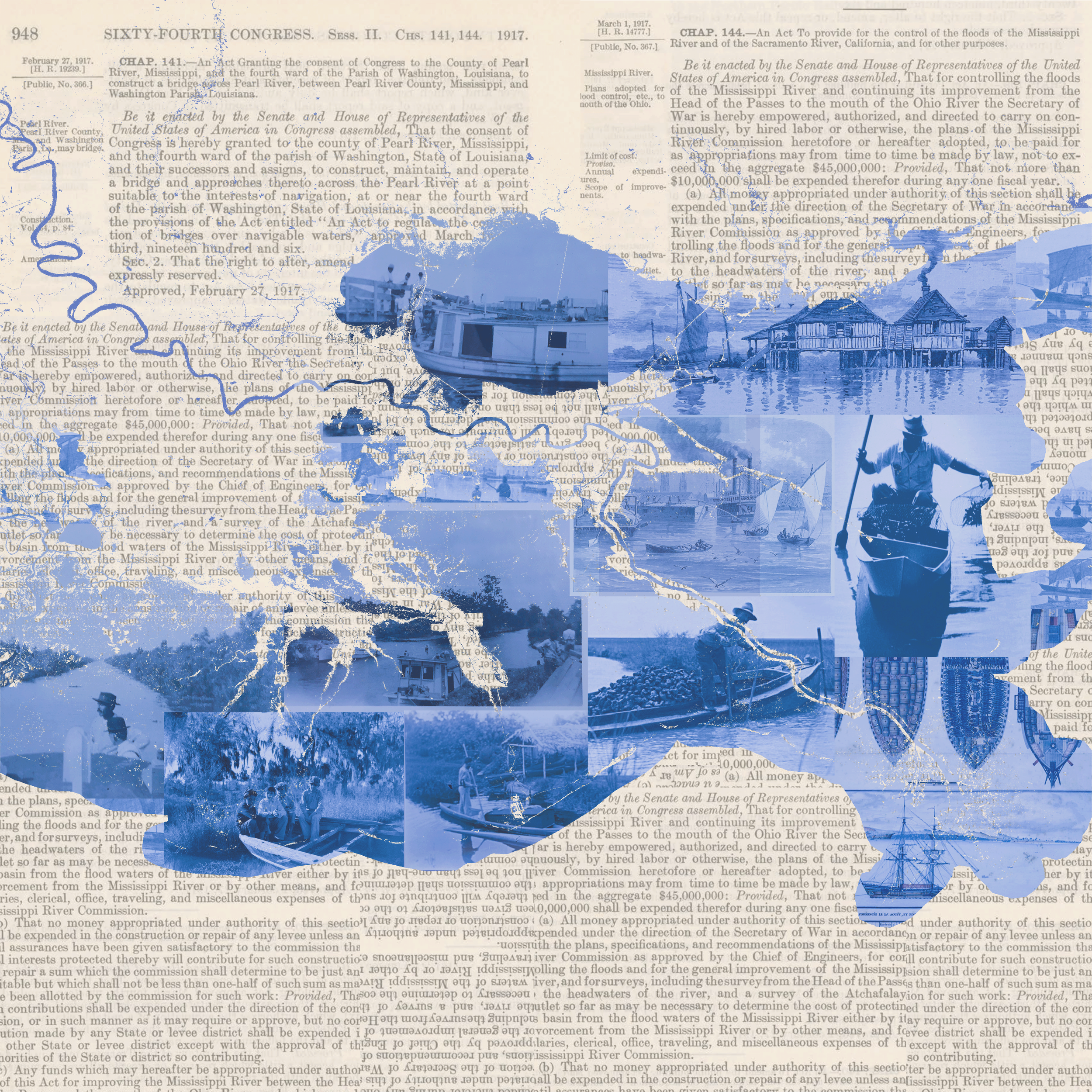 Significant portions of New Orleans are aqueous spaces that continue to be traversed on flat bottom boats. In this piece I highlight the region of the lower Mississippi Delta that is wetland or swamp using archival images of canoes, skiffs, and pirogues. At the backdrop of this aqueous landscape is the document detailing the 1928 flood control act written by congress. The memory shown as embedded in these landscapes juxtapose the flood control act which emphasizes technical factors in the drainage project.