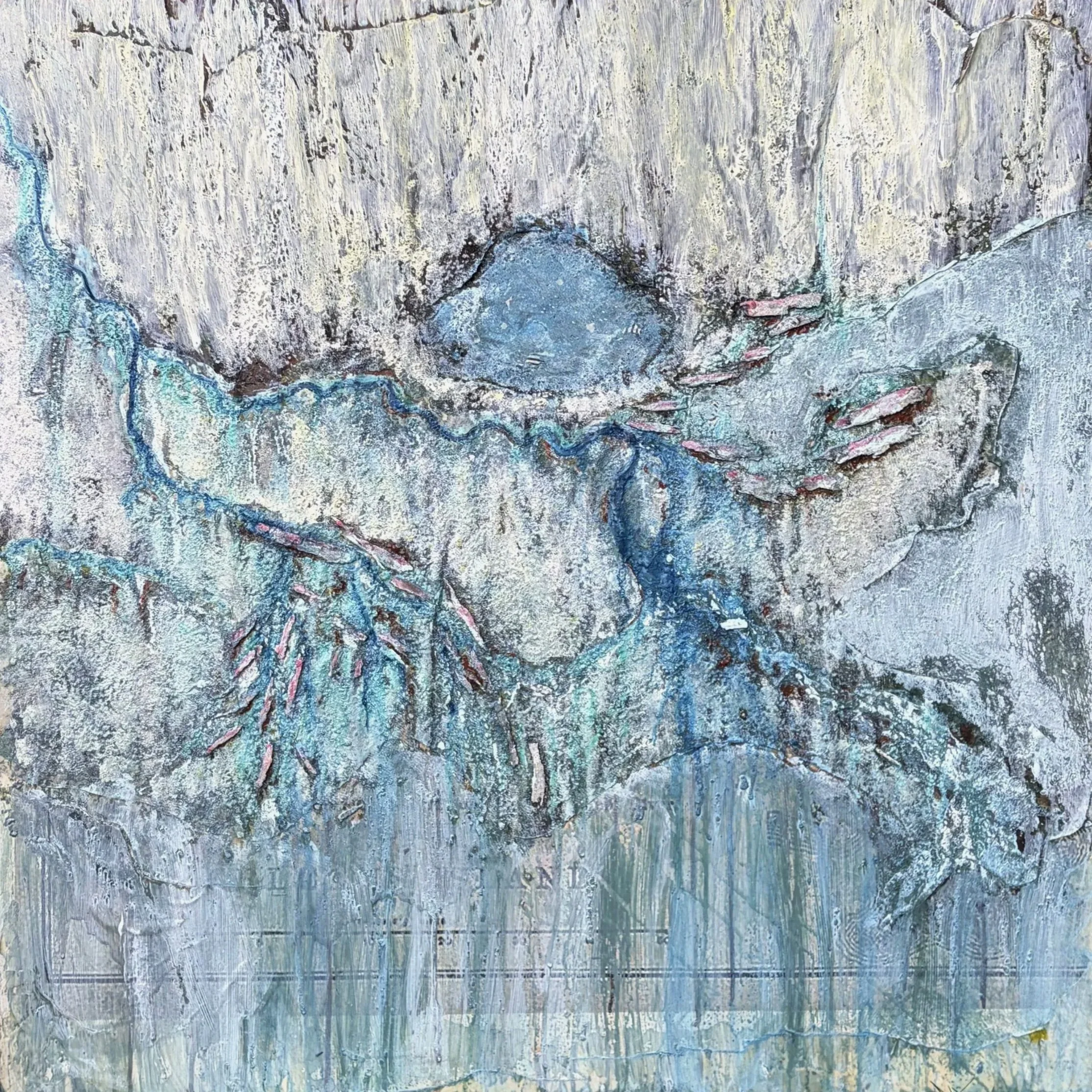 Acrylic, Gesso, dirt, bark, and vellum on canvas