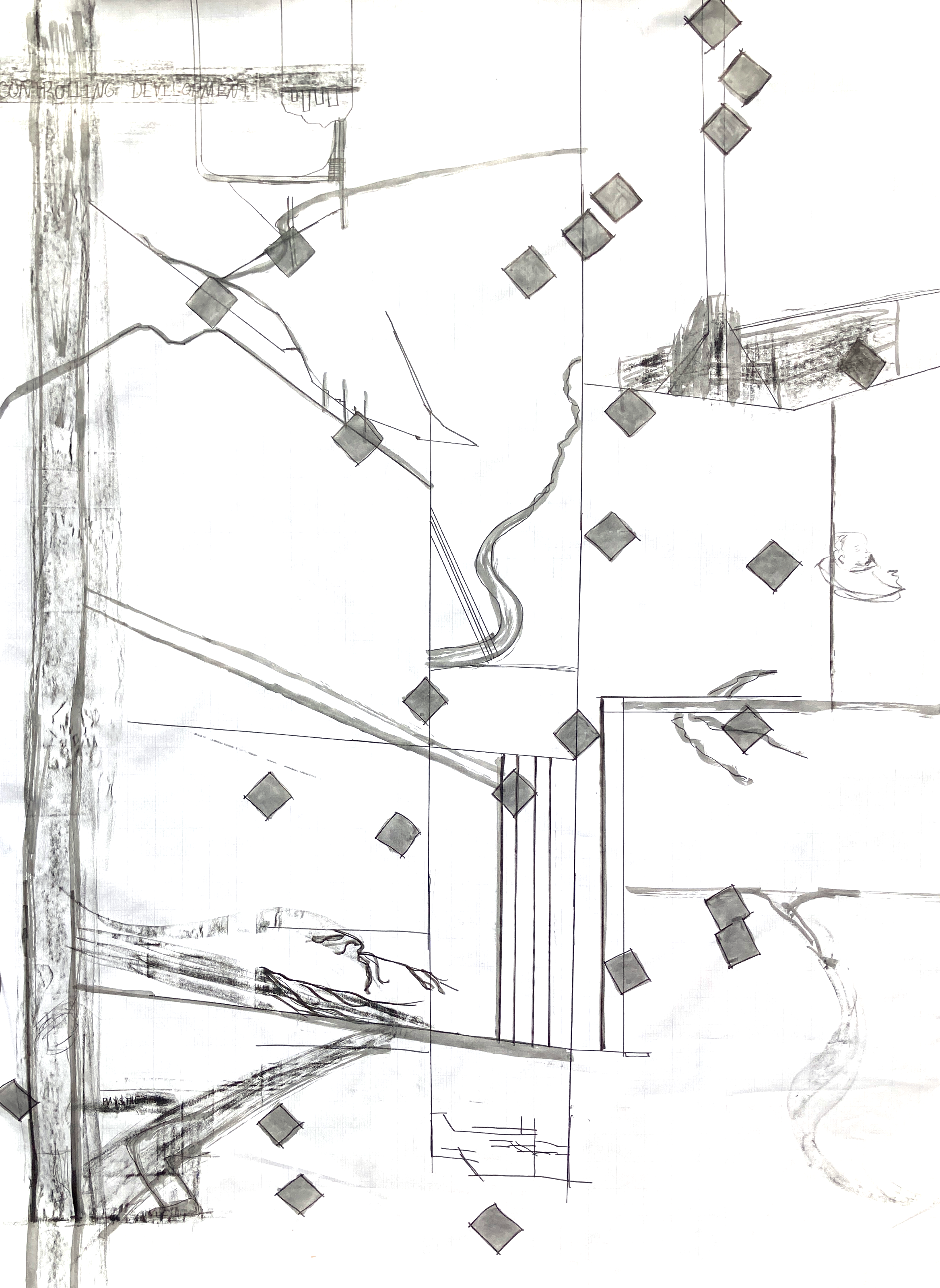 Blueprint of Loss explores the relationship between Dams on the Saskatchewan River and social services creating a critical cartography that is rooted in a place based historical analysis. The ink depicts the structural, engineered, and designed elements such as dam blueprints, surveys, typically seen as progress contrasts with the lighter feathered charcoal, portraying histories of loss.