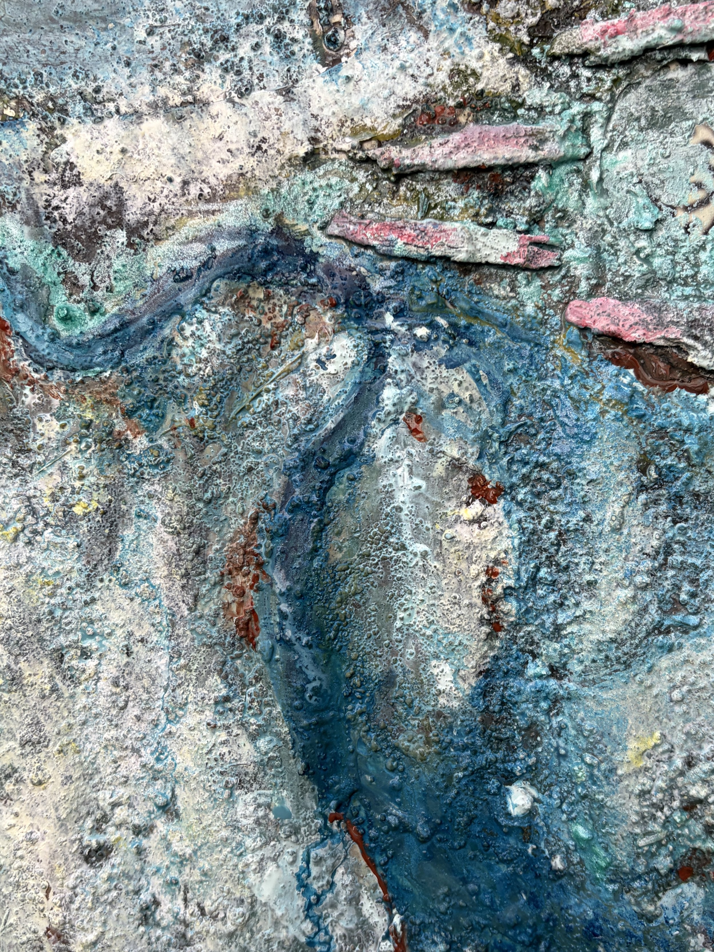 The flat bottom boats of New Orleans are known as Beteau, a shallow-draft, flat-bottomed boat. Unlike large colonial ships which were built to transport extracted resources and enslaved peoples, flat bottom boats were used to access the shallows of rivers, marsh, wetland, and swamp. Their flat bottoms assisted maroons find refuge from the inhumane conditions of slavery. Bateaux became apart of a larger flat bottom boat network on the Mississippi River and the lower Delta, neighboring Houma Nation. This heavily textured piece portrays the lower Mississippi Delta with acrylics and soil that blurs the ending and beginning of land, swamp, and water.