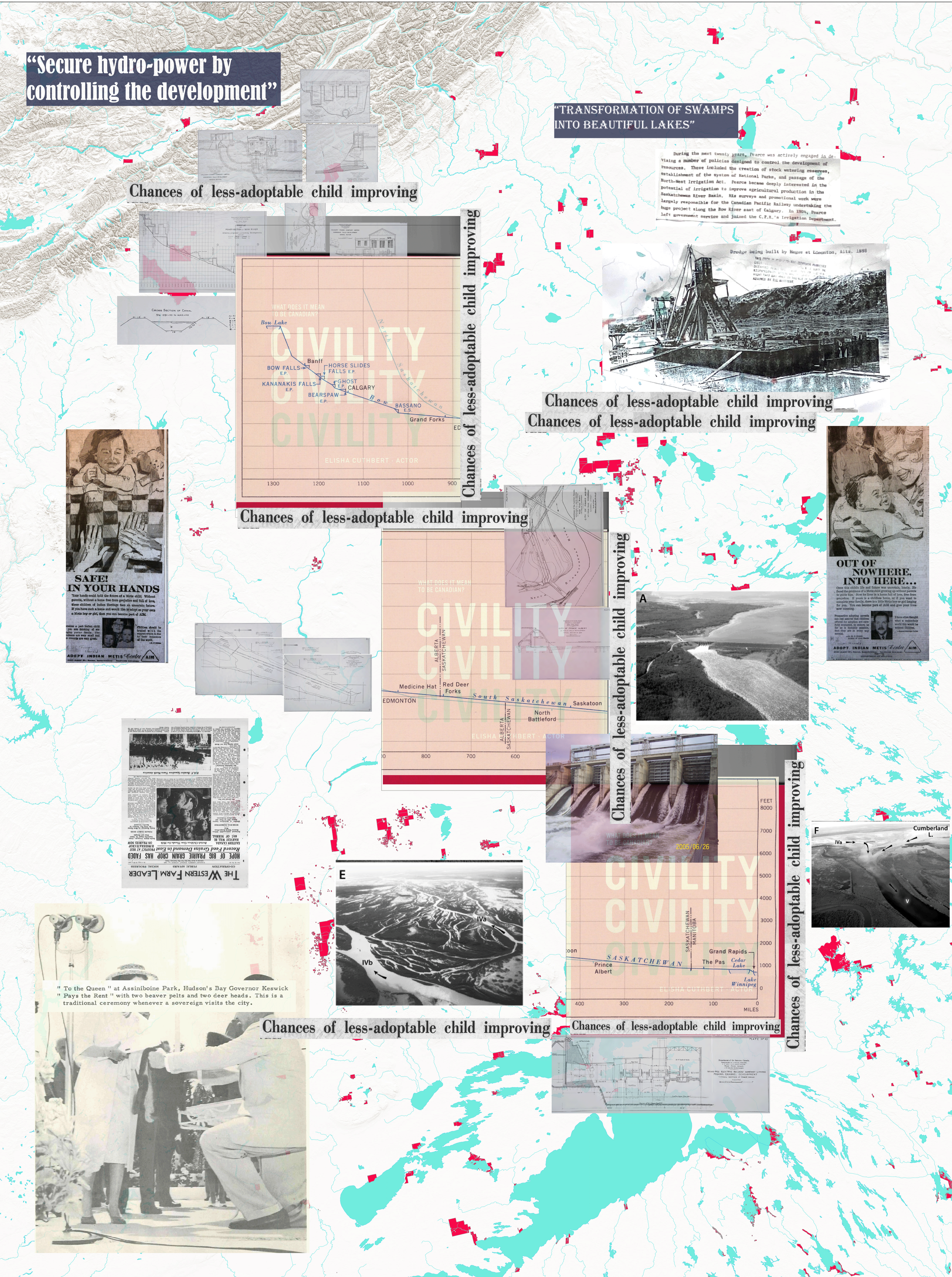 Archival surveys and historic studies of the River for Dam development are placed over the location of the river a long with repetitive words that were found in the archive to describe Canada as "Civility, Civility, Civility”. This evokes the painful history of settler-colonialism under the guise of “helping” and “Improving”, landscapes and Indigenous people experience ecocide at the hands of agricultural development and social services.